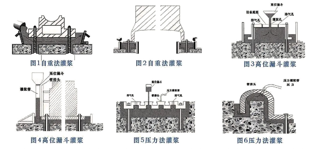 ① 二次灌浆时,应从一侧或相邻的两侧多点进行灌浆,直至从另一侧溢出为止,以利于灌浆过程中的排气。不得从四侧同时进行灌浆。
